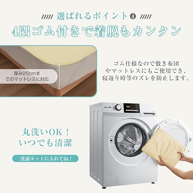 【商品情報】サイズ:140×205cm 素材:表パイル部分:綿100% 表基布部分:ポリエステル100% 裏面:ポリウレタンコーティング ※四隅ズレ防止のゴムバンドが付き、厚み25cmまでのマットレスと敷き布団に対応。ネットに入れて頂ければ洗濯機での丸洗いOKです。