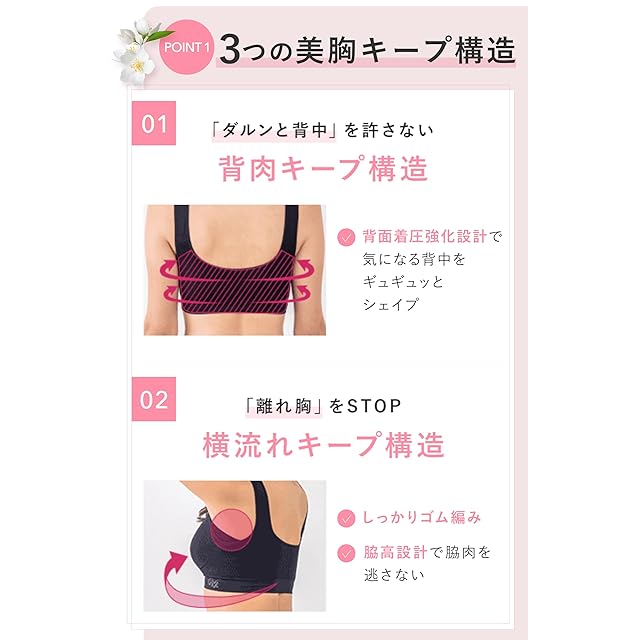 ②「離れ胸」をSTOP<横流れキープ構造> ・しっかりゴム編み ・脇高設計で脇肉を逃がさない