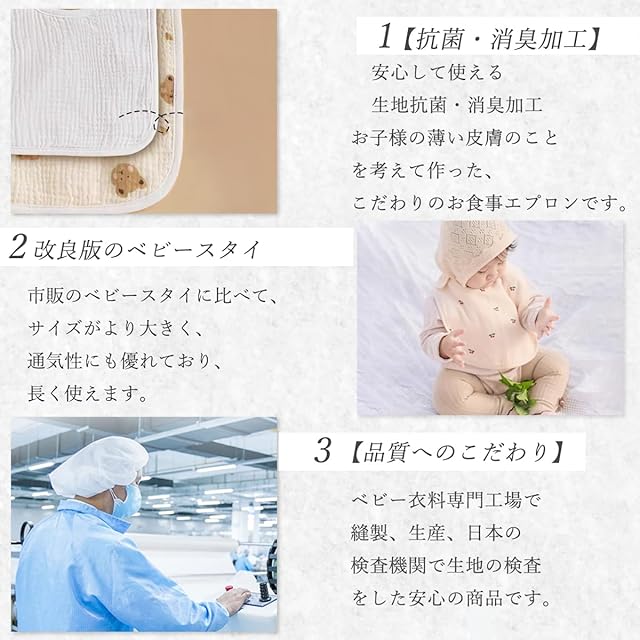 【赤ちゃん発想のあんしん設計】生後3ヶ月の赤ちゃんから3歳になる子供も使用可能です。首の後ろではなく、スナップボタンで横で止めるタイプです。ボタンが横にあり横抱きでも、首が痛くなる心配がありません。シンプルで高見えデザインと仕様なのでプレゼントにもおすすめです。