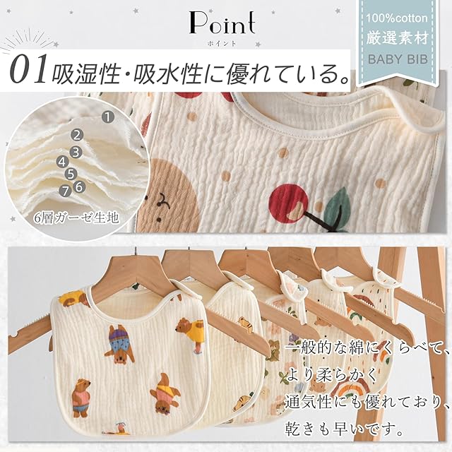 【肌に寄り添う上質素材】ダブルガーゼ生地が重なって、6重ガーゼになったベビースタイです。赤ちゃんの薄い皮膚に配慮し、高級綿100%を採用。一般的な綿にくらべて、より柔らかく通気性にも優れており、乾きも早いです。