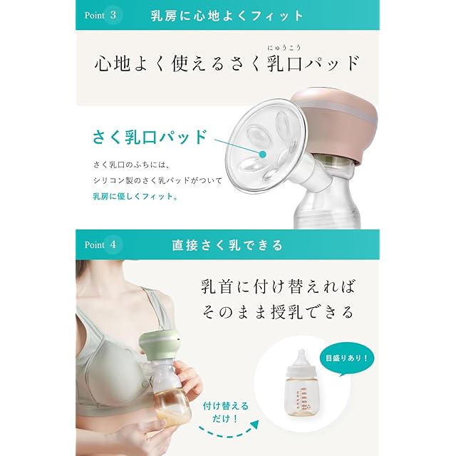 【直接さく乳できる】乳首に付け替えればそのまま哺乳瓶となり授乳が可能です。目盛り付きなので、便利です。