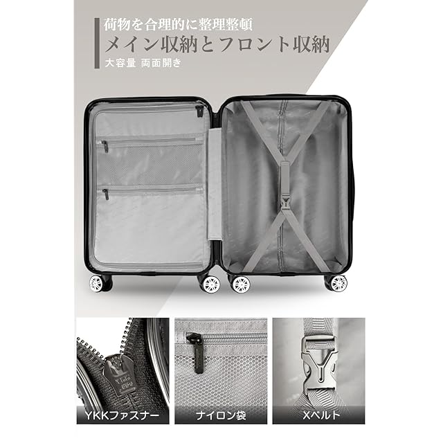 【高品質なボディ&信頼のYKKファスナー】ABS樹脂は軽くて弾力性と割れに強く、PC(ポリカーボネート)樹脂は耐衝撃性・断熱材に優れる、両素材を混合した耐久性が高いハードタイプの高品質ボディを実現しています。また、日本が世界に誇るYKKファスナーをメインファスナーに標準装備。ファスナータイプのスーツケースによくあるファスナーの不具合(ファスナー脱線や開き)を解消し、長期にわたり安定した使用感が可能となりました。