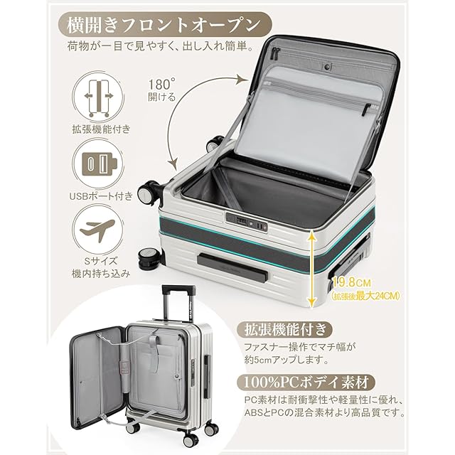 【横開きフロントオープン&容量拡張機能】革新的なフラットトップ開閉で、狭いスペースでもスムーズに荷物を出し入れ可能。大容量の収納スペースが1つあり、深い奥行きにより、かさばるお土産や厚手の服、靴などもすっきり収納できます。さらに、スーツケースの拡張ジッパーを開けるだけで、マチ幅が5cm広がり、容量が20%増加。必要なときにすぐにスペースを拡張でき、旅行の柔軟性を高め、効率的に荷物を収納できる。