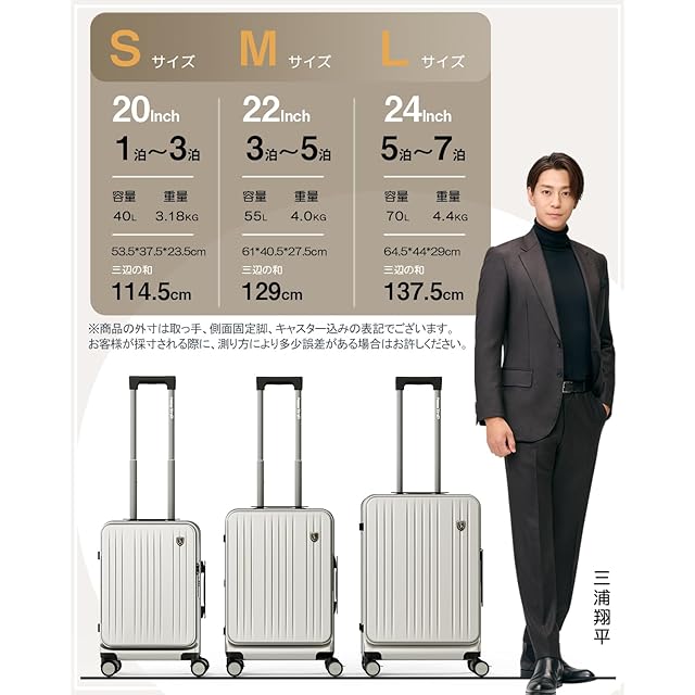 【高品質のPC100%ボディ&信頼のYKKファスナー】スーツケースのボディには、軽さと耐衝撃性に優れたPC(ポリカーボネート)100%を採用。旅行中の衝撃にも強く、大切な荷物を守ります。また、日本が世界に誇るYKKファスナーを搭載し、一般的なファスナータイプのスーツケースによくあるファスナーの不具合(ファスナー脱線や開き)を解消し、長期にわたって安心してご使用いただけます。