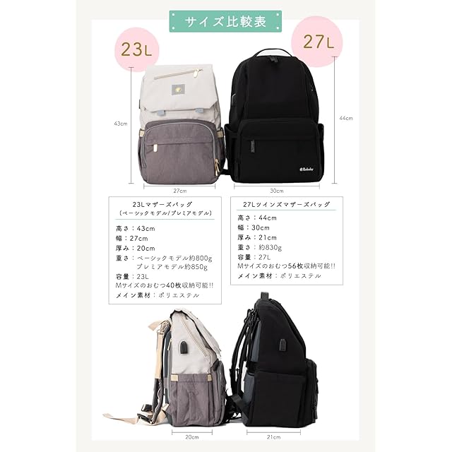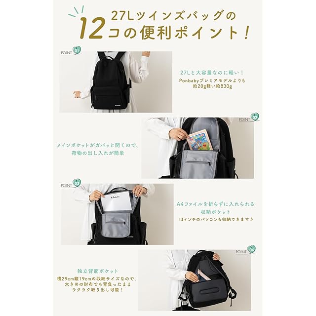 【Ponbabyユーザー様の声から生まれた大容量27Lモデル】Ponbaby 23Lマザーズバッグの商品レビューで『23Lの容量でも小さかった。もっと大きいマザーズバッグが欲しい』『荷物が多くなりがちな私にとって少し小さかった』などのお声を数多く頂いておりました。今回そんな荷物が多くなりがちなママたちと共同開発しました。 27Lの大容量かつより機能的なマザーズバッグです。。ベビーカーのハンドルに吊り下げられて、充電のUSBポートも付いた優れもの。ワンタッチバックルも付いた大容量なのに軽くてお出かけが楽しくなるリュックサックです。