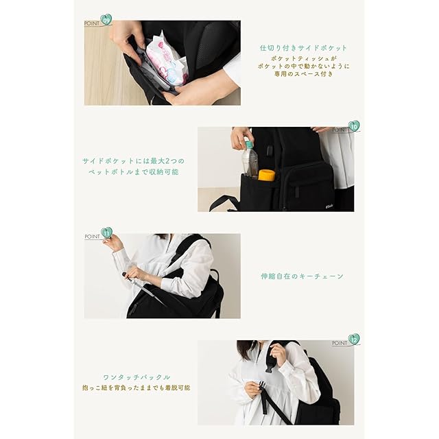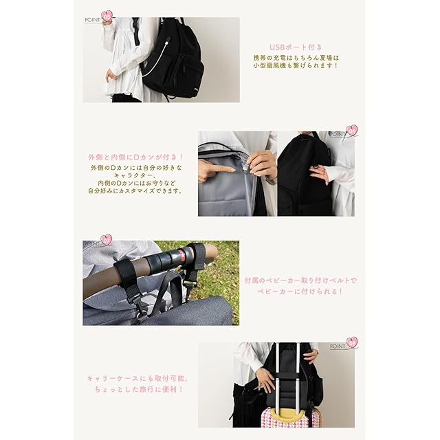 【うれしい背面ポケット】多機能収納ポケットはもちろんのこと荷物を背面のチャックから直接出し入れできるポケット、背負ったままでも貴重品を出し入れできる大きな背面ポケット付き。哺乳瓶は断熱の保温できる防水ポケット、2Lのペットボトルも入るビッグサイドポケット、貴重品、おむつ、着替えもキレイに収納できます。伸びるキーチェーンやスマホの充電ができるUSBポート付き。
