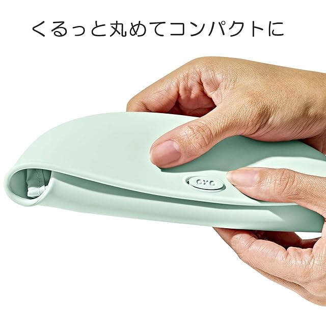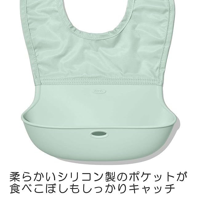 布部分を丸めてコンパクトに持ち運びできるシリコンビブ。ポケットが食べこぼしをキャッチしてくれます。汚れを簡単に拭き取れてお手入れも簡単。洗濯機使用もOKです。