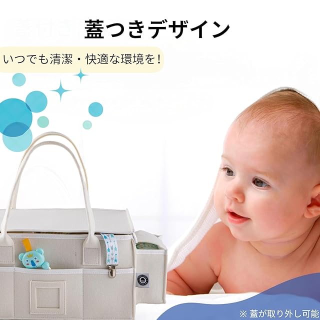 【衛生面に配慮して蓋つきに改良】見せたくない中身を隠せるだけではなく、ほこりが入らないため衛生的にオムツを収納できます。【可動式の仕切り】入れるもののサイズに合わせて使いやすいようにマジックテープで自由にカスタマイズが可能、細かいグッズもきちんと整理整頓できます。