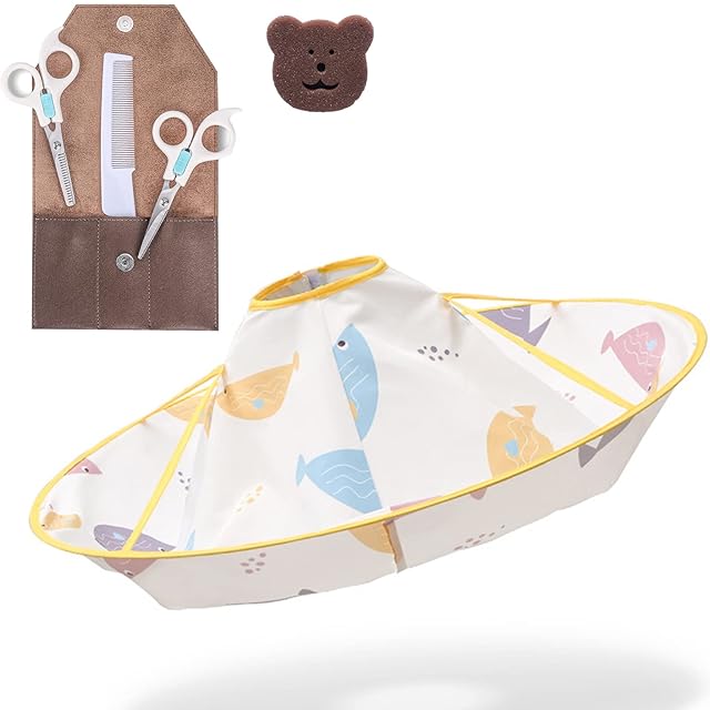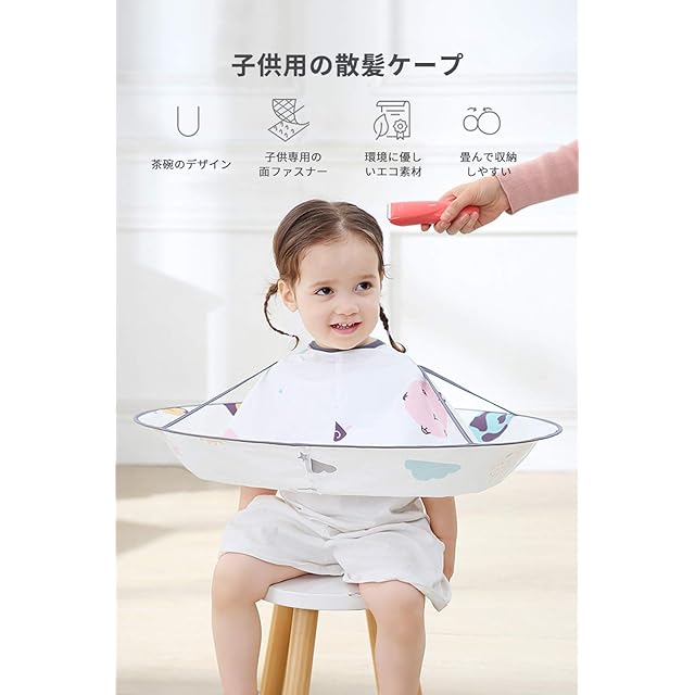 【商品詳細】品名:子供散髪ケープ、材質:ポリエステル。サイズ:使用時/直径約60cm、収納時/約29cm 。本体重量:約80g(年齢の目安:0~10才)品名:カットシザー (幅×奥行×高さ) :14.5cm×2cm×6.5cm