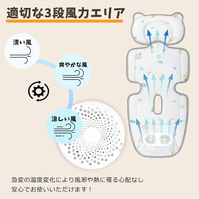 【通気性設計】3段階の風速調整機能付きベビーカー用冷却パッド。夏の旅行も怖くありません。タイマー機能付きで、時間制限なしで使用できます。2時間、4時間、6時間のタイマー機能を備えており、赤ちゃんがいつでも清涼感を楽しめます。