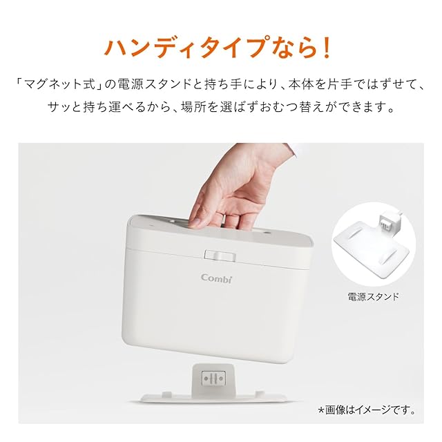 「マグネット式」の電源スタンドと持ち手により、本体を片手ではずせて、サッと持ち運べます。