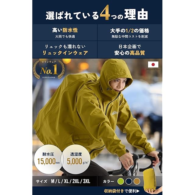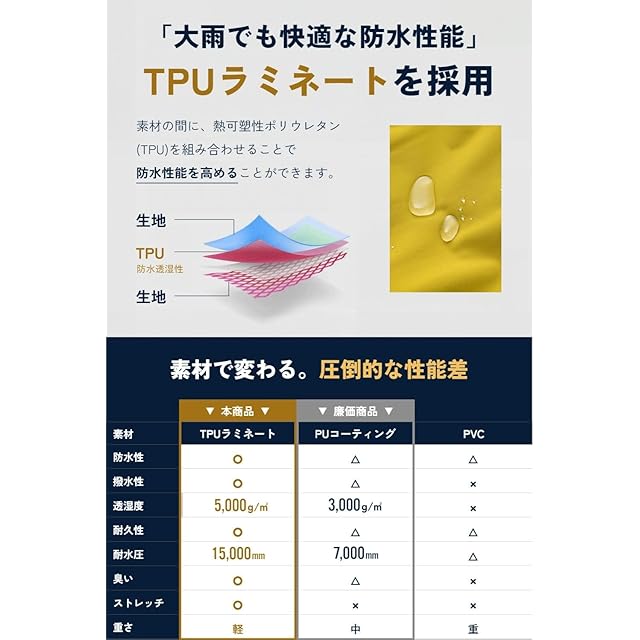 ✅【大雨でも快適な耐水圧15,000mm・透湿5,000g/㎡の高性能】 自転車やバイクでの運転を想定し、高い防水性とムレにくい透湿性を両立。高品質なTPUラミネート採用で快適な着心地が保つことができます。通勤、通学時のレインコートとしても使いやすいと評判です。【国内検査機関の防水テストをクリア】 防水性能については、全て国内の大手検査機関にて品質を確認しております。