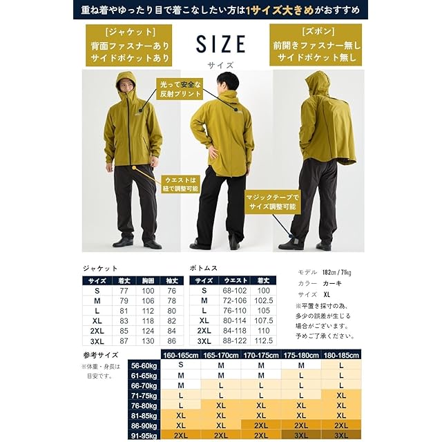 ✅【メーカー1年】万が一の不具合にも[返品/交換]を迅速に対応致します。【重量】ジャケット約400g、パンツ約210g【メイン素材】 ポリエステル【利用シーン】登山、釣り、バイク、アウトドア、キャンプ、サイクリング、防災など 【機能】■防水/撥水加工(耐水圧15,000mm)、防風 【サイズ】 S~3XL <ジャケット> 着丈(背面) / 胸囲 / 袖丈 [S] : 77 / 100 / 76 [M] : 79 / 106 / 78 [L] : 81 / 112 / 80 [XL] : 83 / 118 / 82 [2XL]: 85 / 124 / 84 [3XL]: 87 / 130 / 86 <パンツ> ウエスト / 着丈 [S] : 68‑102 / 100.5 [M] : 72‑106 / 102.5 [L] : 76‑110 / 105 [XL] : 80‑114 / 107.5 [2XL]: 84‑118 / 110 [3XL]: 88‑122 / 112.5