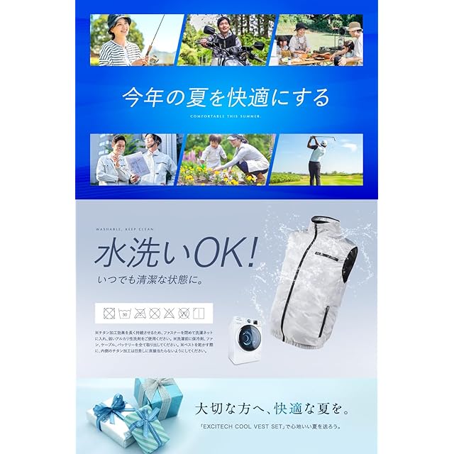 ✅【2025年最新ファン付きベスト】Excitech(エキサイテック)COOL VESTの裏地には、チタンコーティング加工と撥水加工を施し、紫外線遮蔽率99.9%※、遮熱性※にも配慮した最新型のファン付き作業用ベストです。 裾のドローコードにより風の逃げを軽減し、衣服内の冷却効果をサポート。 さらに、背中から首筋にかけて風が流れるように設計されており、涼しさをより体感しやすくなっています。 ファスナーには耐久性に配慮した素材を採用。また、保冷剤ポケットや多機能収納ポケット・ペン差しも備え、機能性と利便性を両立しています。 ※紫外線遮蔽率、遮熱性、撥水性はJIS規格に準拠した第三者機関の試験による結果に基づいています。 ※風の感じ方や涼しさの体感には個人差があります。使用環境や着用条件により異なります。