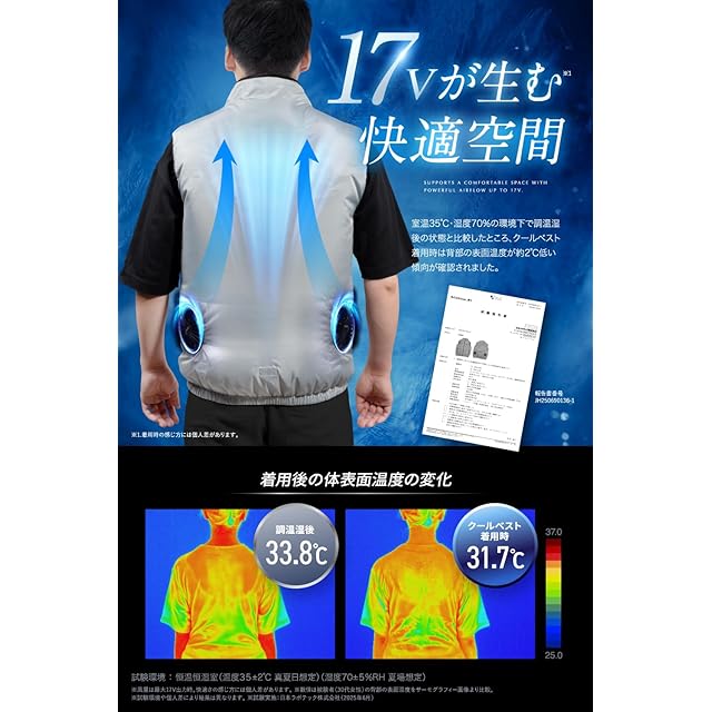 ✅【2025年最新ファン付きベスト】Excitech(エキサイテック)COOL VESTの裏地には、チタンコーティング加工と撥水加工を施し、紫外線遮蔽率99.9%※、遮熱性※にも配慮した最新型のファン付き作業用ベストです。 裾のドローコードにより風の逃げを軽減し、衣服内の冷却効果をサポート。 さらに、背中から首筋にかけて風が流れるように設計されており、涼しさをより体感しやすくなっています。 ファスナーには耐久性に配慮した素材を採用。また、保冷剤ポケットや多機能収納ポケット・ペン差しも備え、機能性と利便性を両立しています。 ※紫外線遮蔽率、遮熱性、撥水性はJIS規格に準拠した自社または第三者機関の試験による結果に基づいています。 ※風の感じ方や涼しさの体感には個人差があります。使用環境や着用条件により異なります。