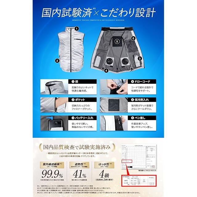 ✅【国内検査済・第三者検品・PSE認証済み】本製品は、日本国内の試験機関にて、以下の基準に基づき検査を実施しております。 ・紫外線遮蔽率:99.9%(JIS L 1925 準拠)・遮熱性:41%(JIS L 1951 準拠)・はっ水性能:JIS L 1092 に準拠した試験により確認済みです。 さらに、製造後は当社と独立した第三者検品機関にて外観・品質のチェックを実施しております。 また、付属のモバイルバッテリーは、PSE認証(電気用品安全法に基づく適合性検査)を受けており、適合マークを表示しています。