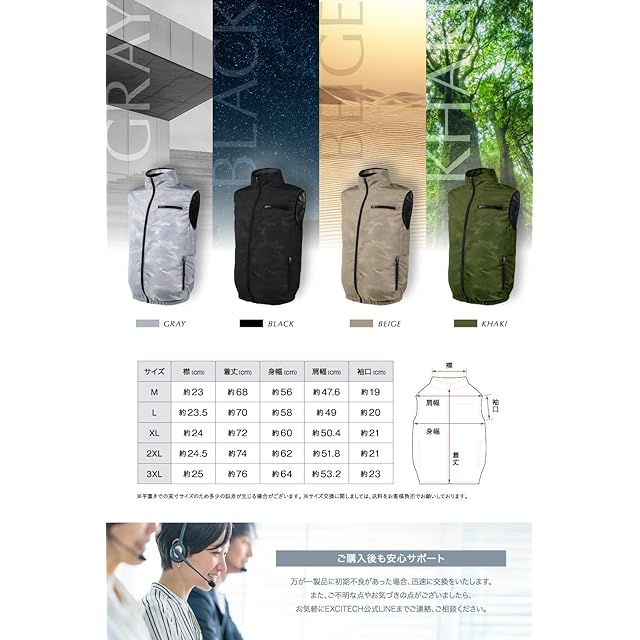 ✅【日本企画安心サポート】製品についてご不明な点やお気づきの点がございましたら、弊社カスタマーサポートにお気軽にご連絡、ご相談ください。【内容物】ベスト、ファン、バッテリー、ケーブル、充電用Type Cコード、日本語取扱説明書(書付き)※本商品にはACアダプターは付属されておりません。 ※修理・交換の際には書の提示が必要となりますので大切に保管していただきますようお願い申し上げます。 ※EXCITECH COOL VEST専用のファン、バッテリーを必ずご使用ください。他社製品と組み合わせて使用しないでください。(期間内でも弊社専用機器以外を接続したことによる故障は対象外となります。) ※充電時、定格電源:DC5V⎓2Aに対応したアダプター以外を使用して故障した場合や、EXCITECH COOL VEST以外の製品に使用して故障した場合は、期間内でも対象外となります。