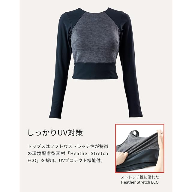 【デザイン】露出の少ない胸元で着脱しやすいUバック。飽きのこない上品なミックスカラーに加えボトムスは身体のラインをひろわず、水中での透けも気にならない素材を採用。ホールド感のあるハイウエスト設計で、どんな動きをしても安心。