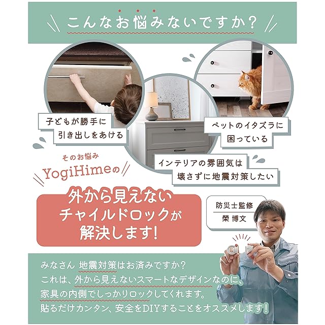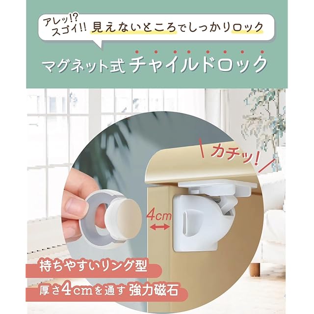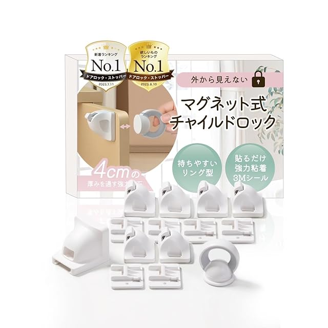 ✅【2023日本のチャイルドロック専門ブランドが開発】お客様の声をもとに持ちやすい【リング型マグネットキー】を開発。丸型に比べ、お子様の誤飲リスクも大幅軽減。【4センチの厚みを通す強力磁石】も併せて開発しました。✅【防災士監修・美しい景観を損なわず、地震対策】キャビネットや引き出しの内側にに取り付けることで、お部屋の美しさを損なわずにご利用いただけます。お子様やペットによるいたずらや怪我の心配を大幅に軽減できるだけでなく、地震対策にも有効です。厚さ40mm以内のキャビネット、引き出し、タンス、戸棚、食器棚などに対応しています。✅【リング型マグネットキー】安全性と機能美を追求した形になっています。✅【マグネット式ロック解除で簡単操作】マグネットキーを近づけるだけでロックが解除され、遠ざけると自動的にロックが施されます。ロックをする必要がない場合は、ロック本体のラッチを下げることで、マグネットキーなしで自由に開閉できます。✅【マグネットキーがないと開かない安心設計】従来の引き出しロックとは異なり、赤ちゃんが簡単に解除できてしまう心配はありません。マグネット式チャイルドロックは、キーがないと開けられない構造で、より安全で安心です。キーの保管には、冷蔵庫や金属面に直接貼り付けるか、付属のキーホルダーをお好きな場所に貼り付けて使用してください。※子供やペットの手の届かない場所に磁石キーを保管してください。※金属製やホーロー製など、磁気に反応する扉には使用できません。