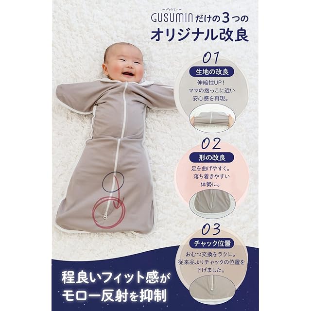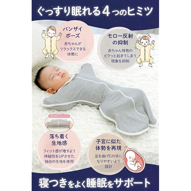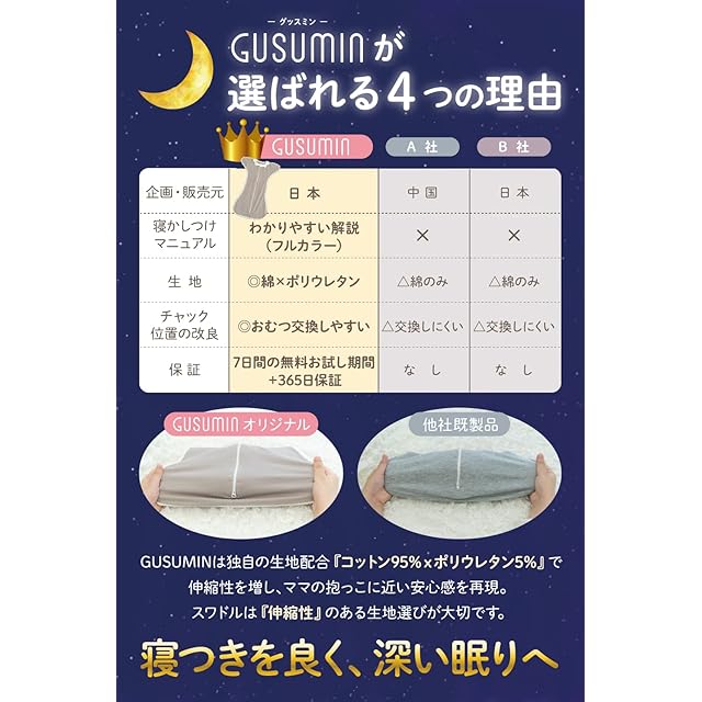 【独自の生地配合】綿100% のスワドル では、脱臼する恐れがあるため、GUSUMIN は安全かつ ママの抱っこを再現 するべく、伸縮性 を増し綿95%、ポリウレタン5%と独自に配合した生地を採用。