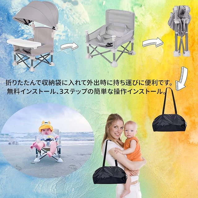 【折り畳んで収納便利】テーブルを外し、椅子を折って収納袋に入れて、3ステップで気楽に取り付けることができます。 折りたたんで収納袋に入れて、外出時に携帯に便利です。 わずか1kgで、ママはレストランやカフェに連れて食事、ママパーティー、公園ピクニックなど。 収納バッグとベビーチェアには、哺乳瓶、食器、おもちゃなどを収納するためのポケットが付いています。