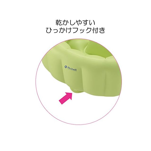 ストッパーが赤ちゃんのずり落ちを防ぎます。背中にぴったりフィットして、姿勢をキープします。腕にやさしい横空気層と、丈夫な縦空気層のWエア構造です。座った体勢がつらいときは、シンクでも沐浴できます。