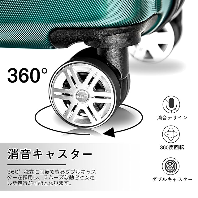 【超静音ダブルキャスター&安心のTSAロック】360度回転可能の8輪ダブルキャスターは、静音と耐久性抜群で、凸凹道でもスムーズに走ることができます。また、世界基準のTSAロック搭載しています。アメリカ空港(グアム・ハワイ・サイパン含む)では必需品です。ダイヤル式ロックなので鍵を無くす心配がないのも魅力です。