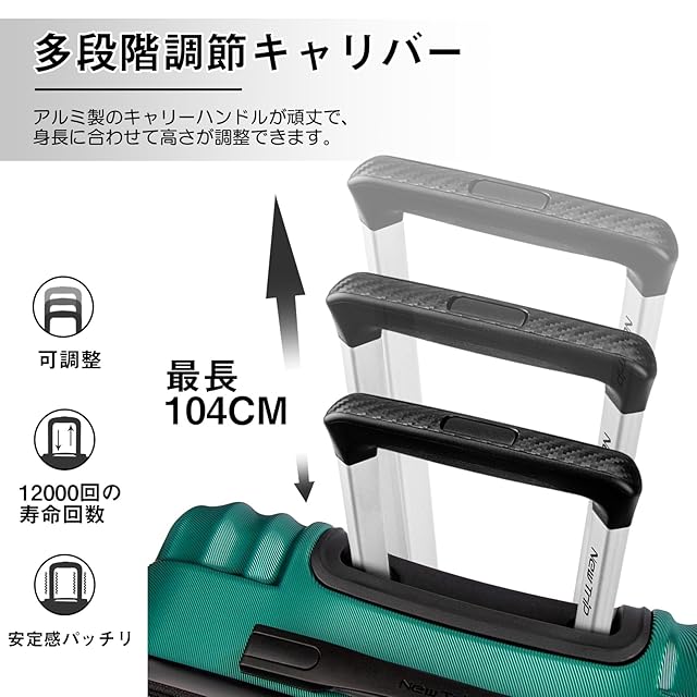 【多段調節キャリーバー&握りやすい2層ハンドル】アルミ合金製の超軽量のキャリバーは伸縮可能で、ご自分の身長に合わせて、最適な高さに調節できます。2層式で設計されたハンドルは、手に当たる部分に柔らかい素材を使用しており、荷物を入れた状態でも手に食い込みにくく長時間持っていても手が痛くなりにくいのが特徴です。
