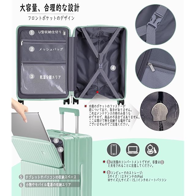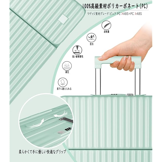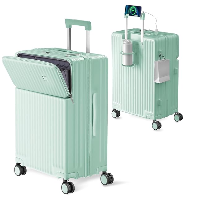 [Ashard] キャリーケース 多機能 スーツケース ストッパー付き Type C と USBポート付き フロントオープン ジッパー キャリーバッグ 携帯スタンド カップホルダー付き 隠しフック機能 超軽量 耐衝撃 静音 360度回転キャスター 100%PC材質 人気 頑丈 可愛い TSAロック搭載 旅行 ビジネス 出張 修学 (Lサイズ/7汨以上/97L/託送必要, グリーン) | つむぎ屋