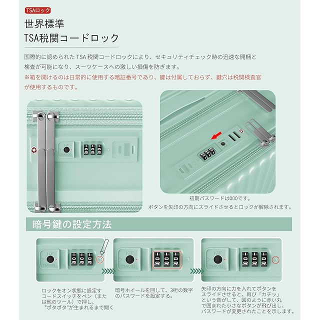 【丈夫かつ軽いPC素材&TSAダイヤル式ロック】表面素材は高耐衝撃性を持つPC(ポリカーボネート)を100%使用。高弾性で、変形しにくい。ABS素材を採用した市販品より頑丈で耐久性に優れ、ABS+PCスーツケースより軽量で持ち運びやすい。PC 素材は、現在市場で最も一般的に使用され人気のあるハードシェル ラゲッジであり、防水性、耐摩耗性、スタイリッシュさ、耐衝撃性、落下耐性を備えています。世界基準のTSAダイヤル式ロックが搭載されて、外出がより安全に。※鍵は航空会社検査専用のため本製品には付属しておりません。