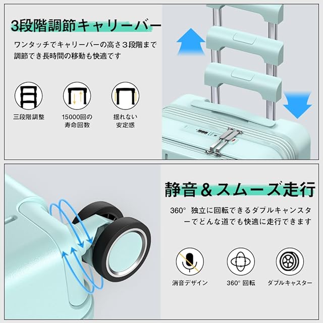 ✅【静音ダブルキャスター・超軽量設計|スムーズな操作性】 360度回転する静音ダブルキャスターと軽量設計で、移動時のストレスを大幅に軽減。人混みの中や段差のある場所でもスムーズな走行が可能です。スーツケース 拡張機能付きでありながら、持ち運びやすさを重視。スーツケース フロントオープンタイプで、機能と操作性を両立させた優秀なキャリーバッグ・キャリーケースです。