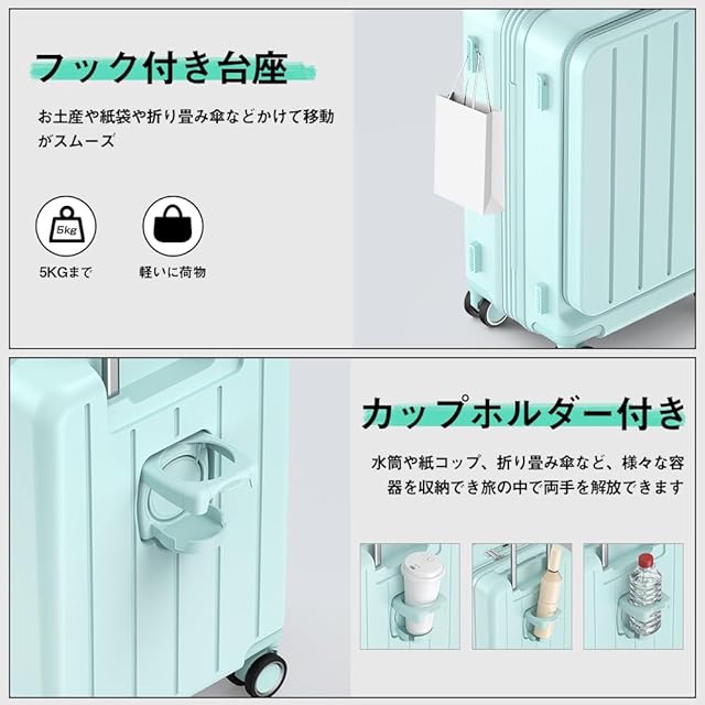 ✅【USBポート・カップホルダー・隠しフック搭載|利便性に優れたスーツケース】 スマホ充電ができるUSBポート、カップホルダー、荷物を吊るせる隠しフックなど、出先での快適性を追求した多機能設計のスーツケース 拡張機能付き。スーツケース フロントオープンだから取り出しも簡単で、時間が限られた移動中にも便利。旅行・ビジネスどちらにも活躍する、洗練されたキャリーバッグ・キャリーケースです。