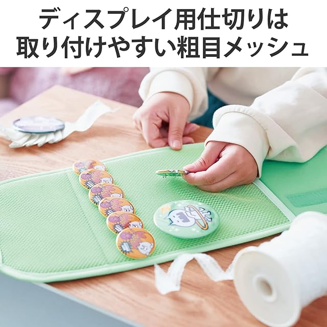 ディスプレイ用仕切りには、ストラップや缶バッジを取り付けやすい粗目のメッシュ生地を採用しています。
