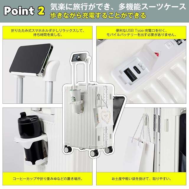 「充電ポート、スマホルダーとカップポルターを付く多機能スーツケース」:スーツケースにはUSB+Type-C充電ポート付く、2種類の充電ポートを内蔵しています。歩いなから充電でき、スマホなど電源切れたの心配がありません。スーツケースの後部に折りたたみ式のカップホルダーを設けています。旅先の飲み物が置き、両手が解放し、旅行を楽しみます。スーツケースレバーの上部にはスマホルダーが付いているので、フライトの待ち時間に両手が自由になり、外出先でもリラックスできます。*注意:本商品内部にはモバイルバッテリーを付いていません、モバイルバッテリーはご自分で用意します。