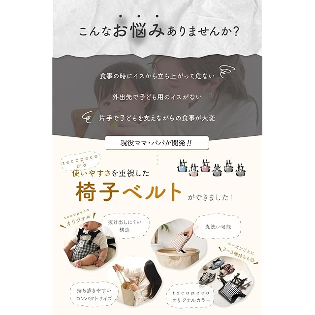 【tecopecoから椅子ベルトが登場♪】tecopecoの椅子 ベルトはお子様が椅子に座る際にずれ落ちないようサポート!食事椅子ベルトは、お子様が椅子から立ち上がったり滑り落ちるのを防ぐことができます!赤ちゃんなどまだ上手に椅子に座ることができない体をベルトでしっかり固定できる!また、軽量で持ち運びがしやすく、折りたたむことができるコンパクトなチェア サポートベルトだから、外食時、帰省時、旅行先でもサッと簡単装着!普通の椅子をベビーチェアに早変わりさせることができます◎