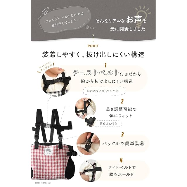 【成長に合わせてサイズ調整可能!】ベルトはお子様の成長に合わせて調節可能!腰すわり期から2〜3歳頃まで使用できるサポートベルトとなっております。成長に合わせてぴったりフィットし、快適に使い続けることができるため、買い替えなくてもOK!体格や年齢に合わせて柔軟に調整できるので、兄弟での使いまわしや長期間の使用にも最適◎