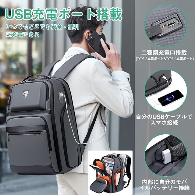 【USB充電ポート設計】リュックサックにはType-AおよびType-Cポートを備え、内部に充電ケーブルを内蔵しています。移動中でも、お手持ちのモバイルバッテリー(別途必要)と接続してスマートフォンを充電できます。メインポケット内には専用の電源ポケットを備えています。※モバイルバッテリーと外部充電ケーブルは付属していません。