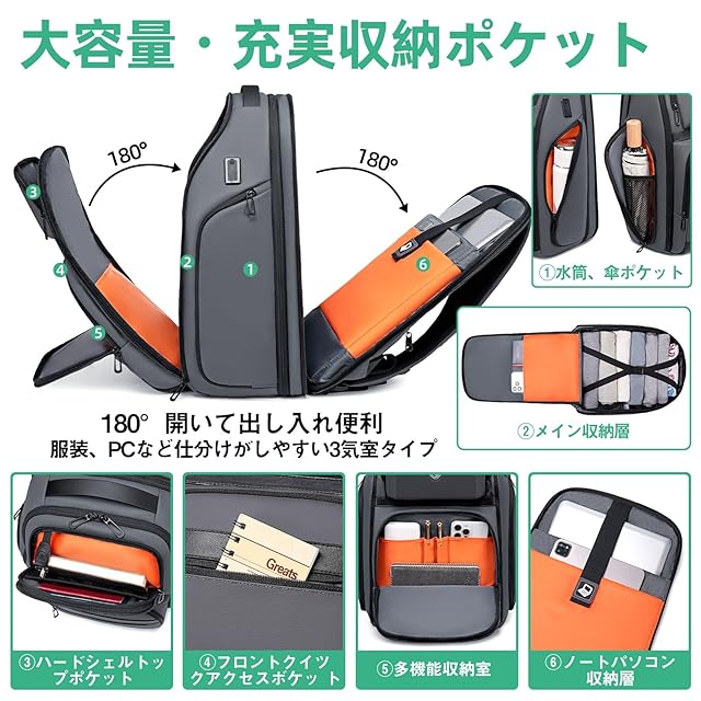【大容量&多用途】広めのメインコンパートメントに衣類や本、書類を収納可能で、内蔵ゴムバンドにより荷物の移動や落下を防ぎます。180度開閉できる設計で、空港のセキュリティーチェックもスムーズに行えます。仕事、大学、通勤、出張、ハイキング、旅行、週末の小旅行、アウトドア活動など、幅広いシーンに対応。日常使いやギフト用途にも最適です。