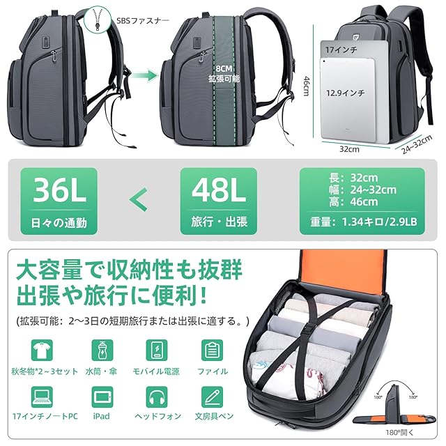【拡張可能なビジネスバッグ 新モデル】ビジネスリュックの側面にあるジッパーで約12Lの容量を追加でき、最大約48リットルまで拡張可能です。サイズ:46×32×24~32cm、重量:約1.34kg。複数のポケットを備え、旅行用品や日常の必需品を収納できます。3〜4日間の旅行や週末の小旅行にも適しています。