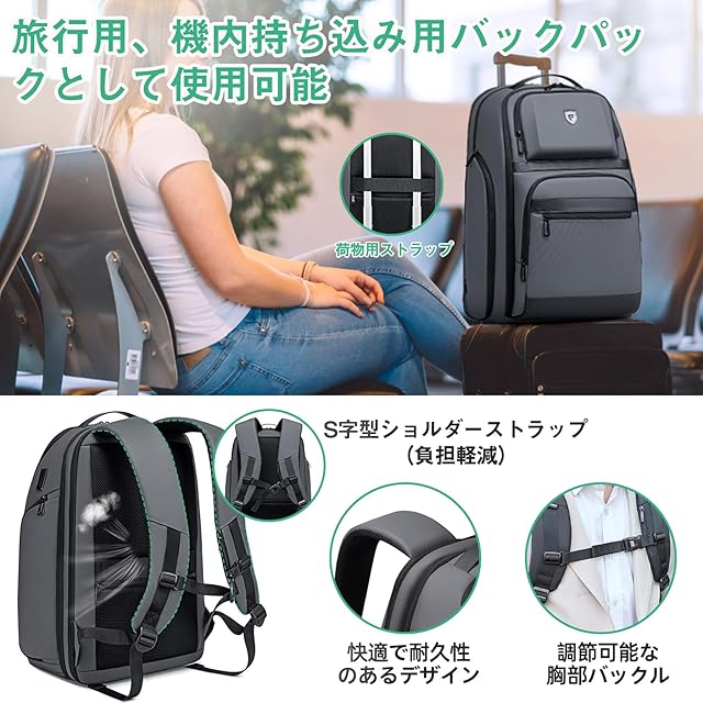 【多機能&使いやすい設計】パッド入りショルダーストラップと3D通気性メッシュパッド入り背面により、肩への負担を軽減し、通気性を確保します。調節可能なチェストストラップは、ウォーキングやサイクリング時の安定性を向上させます。背面のラゲッジストラップでリュックをスーツケースに固定でき、移動時の持ち運びを便利にします。