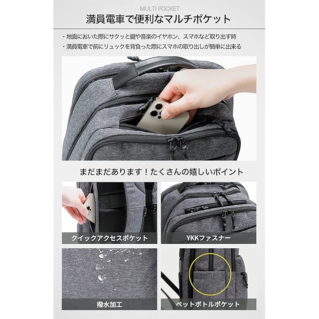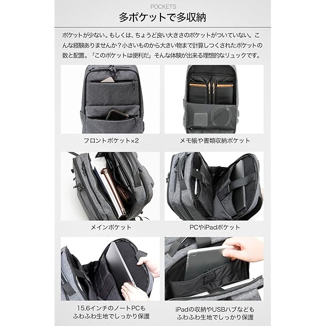 【多ポケット】計算し尽くされたポケットの配置。リュックの中での物の散乱を防ぎます。
