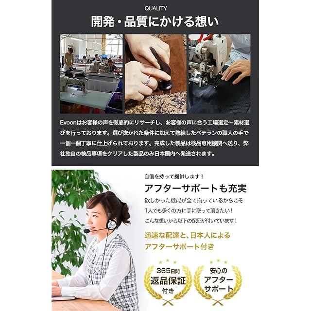 【365日の品質付きで充実】機能性、実用性に自信を持っているからこそも充実!購入後サイズが合わない、すぐに壊れた、不良個所がある等ご不満がございましたらすぐにお問い合わせください。迅速で柔軟にアフターサービスをとらせていただきます。購入前、購入後共に日本人スタッフによるサポートを行わせていただきます。 さらに、お届け後、365日以内の通常利用の破損につきましては、交換などの品質のご対応をとらせていただきます。何かございましたらお気軽にEvoonカスタマーサポートまでご連絡くださいませ。