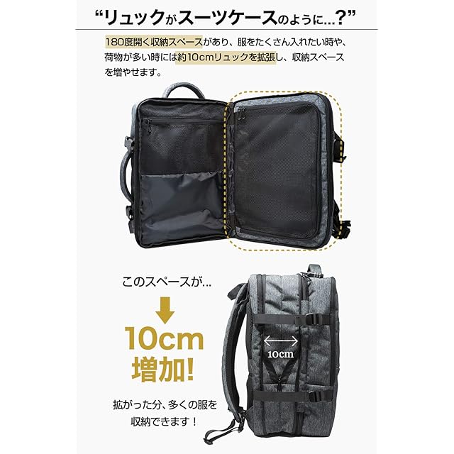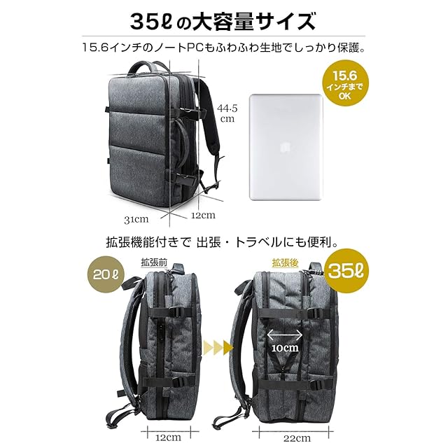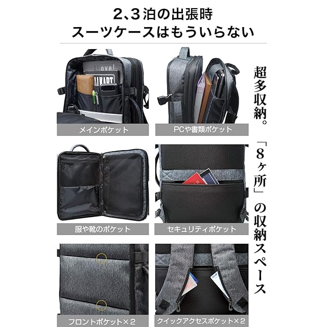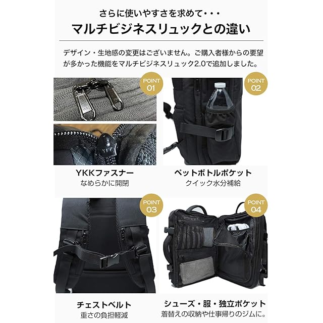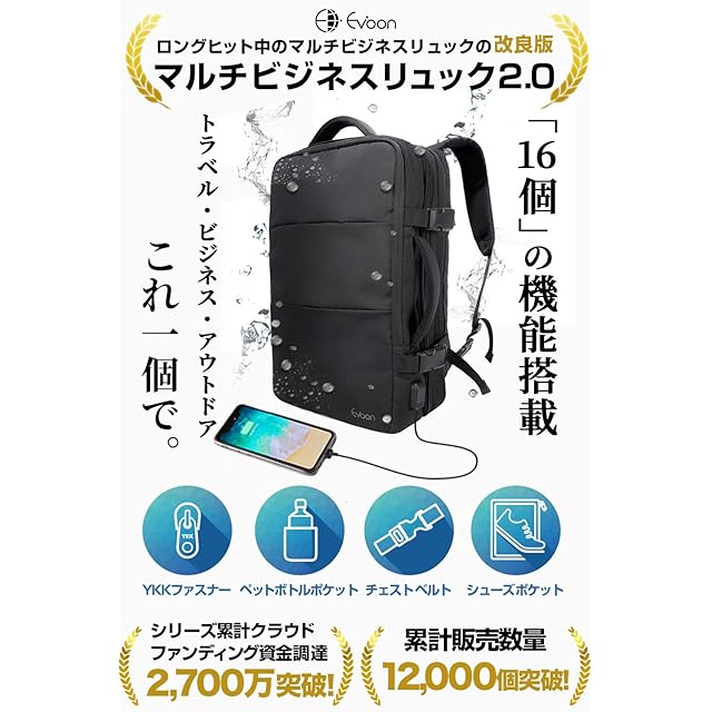 【機能説明】35リットルの大容量/4箇所の防犯機能/2WAYモデル/撥水加工/YKKファスナー/ペットボトルポケット/チェストベルト/15.6インチPC対応/拡張機能/多収納/スーツケースのように使用可能/出張時にスーツケース不要/背面セキュリティーポケット付き/Suicaなどの出し入れ楽々ポケット/USBポート/スーツケース固定バンド/等・挙げ出したらきりがなくなってしまうくらい多機能バックを低コストで完成させました。