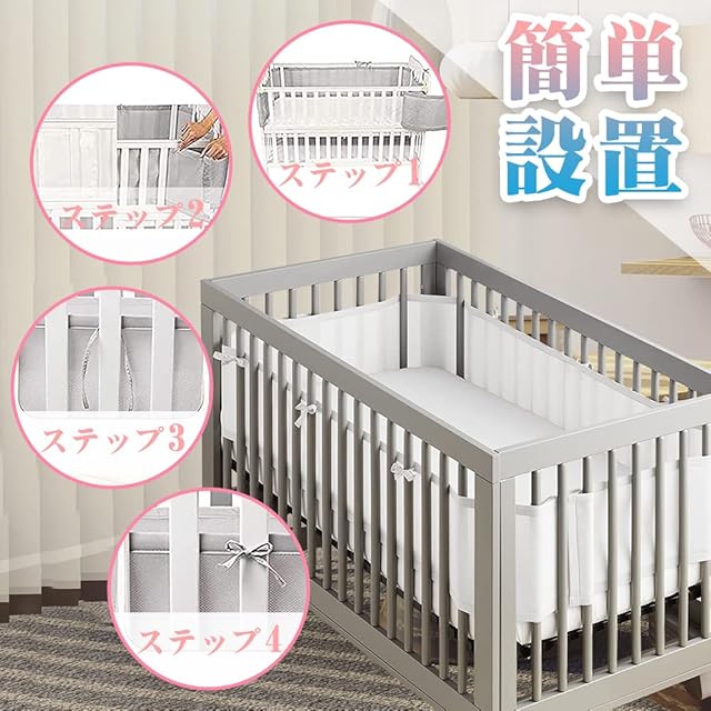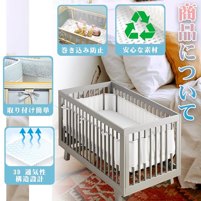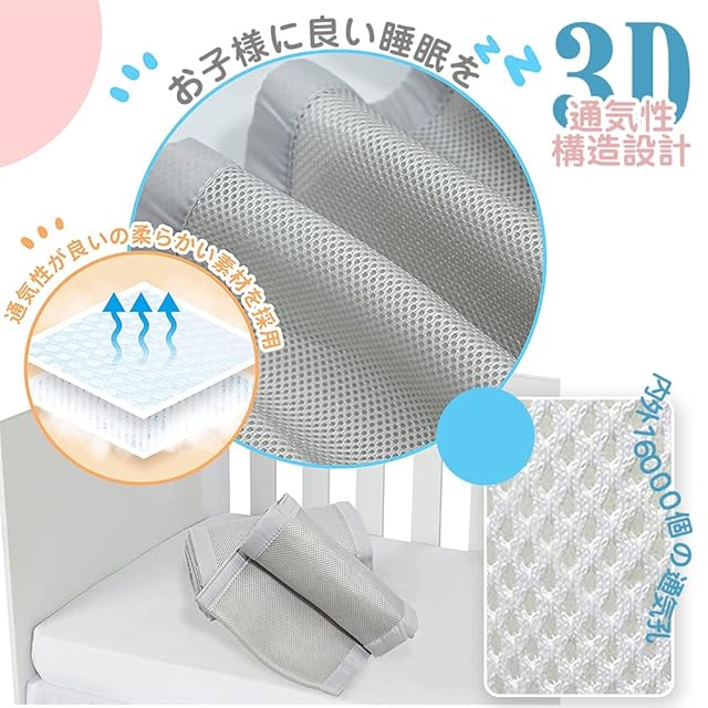 【通気性設計&高品質】:3D立体時通気網穴設計,空気循環を加速させ、湿気と蒸し暑さを簡単に除去し、赤ちゃんに快適でスムーズな呼吸を提供することができるからです。ベッドガードの内外には16000個の通気孔があり,赤ちゃんの鼻がベッドフェンスにくっついていても,赤ちゃんの呼吸の心配はない。高品質素材で作られて、柔らかくて快適で、速乾性、通気性が抜群、赤ちゃんのお肌に優ししくて、長くご愛用ができます。通気性メッシュ生地、低刺激性ポリメッシュ生地、従来のバンパーに安全です。