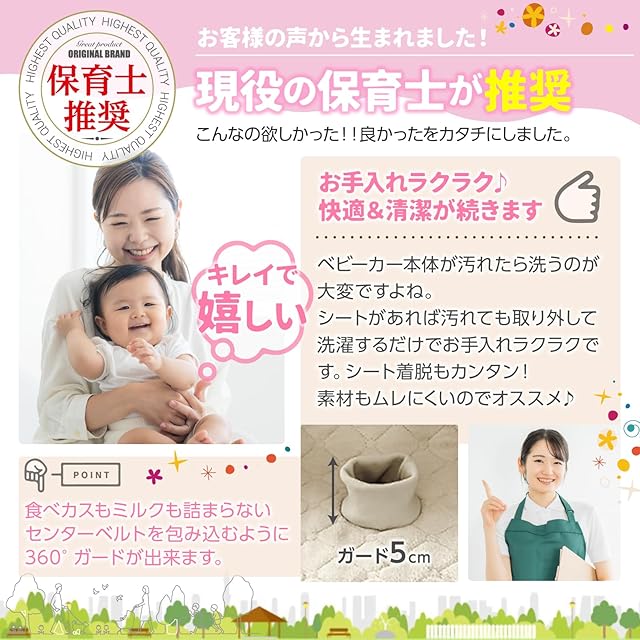 ◆ 高さ5cmのバックルガード付き 特に汚れがちなバックル周りを、立体ガードで360°カバー。食べかすやミルクが隙間に入りません。