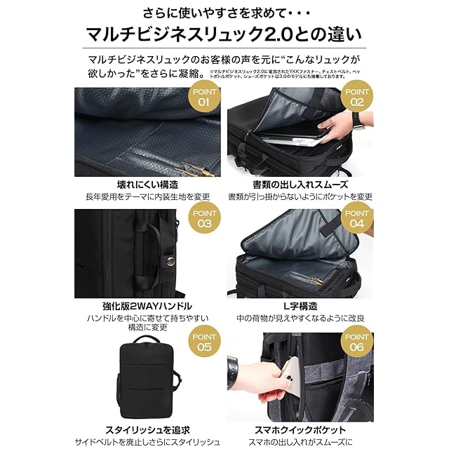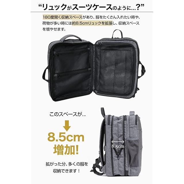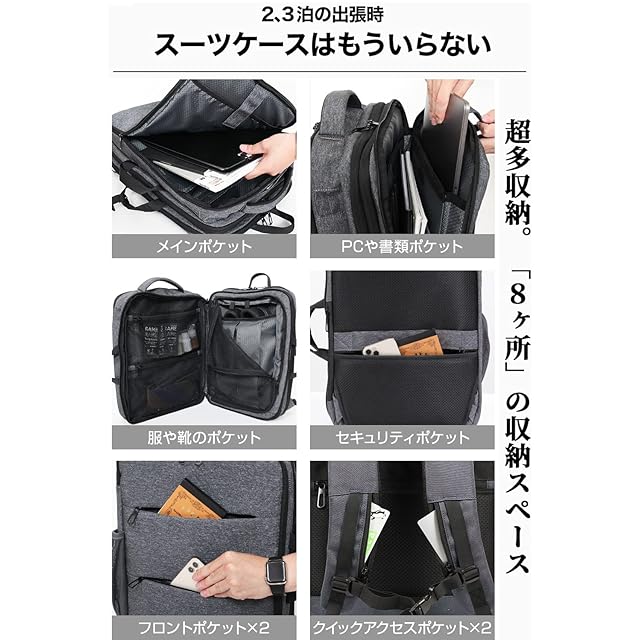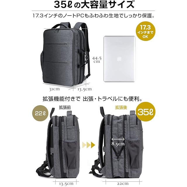 【機能説明】こんな機能が欲しかったをさらに凝縮。35リットルの大容量/3箇所の防犯機能/2WAYモデル/撥水加工/YKKファスナー/ペットボトルポケット/チェストベルト/15.6インチPC対応/拡張機能/多収納/スーツケースのように使用可能/出張時にスーツケース不要/背面セキュリティーポケット付き/Suicaなどの出し入れ楽々ポケット/USB通気口/スーツケース固定バンド/等・挙げ出したらきりがなくなってしまうくらい多機能バックを低コストで完成させました。