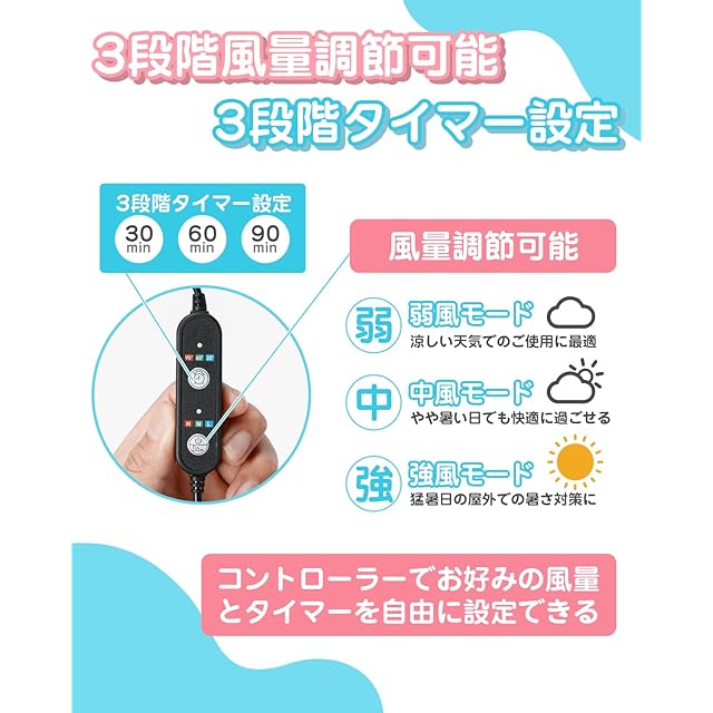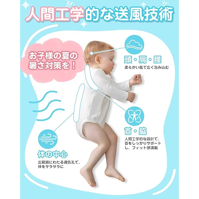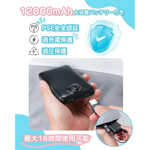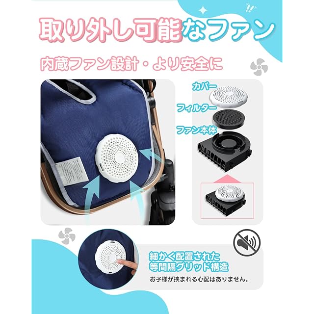 【12000mAh大容量バッテリー&着脱式ファン付き】12000mAh大容量バッテリーと取り外し可能なファンが付属しております。ファンカバーは精密な等間隔グリッド構造を採用しており、お子様の指が挟まれる心配はありません。さらに、3段階タイマー設定機能を搭載することで、設定時間になると自動で電源が切れますので、長時間の送風により赤ちゃんが風邪を引く心配はありません。