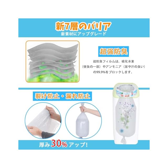 新7層防臭おむつ 袋:オムツ消臭袋最新技術と高機能素材「超防臭フィルム」を採用!7層製造された超強力防臭構造が、気になるニオイを99.9%ブロック。これまでにない防臭力で、数日間放置しても漏れません!