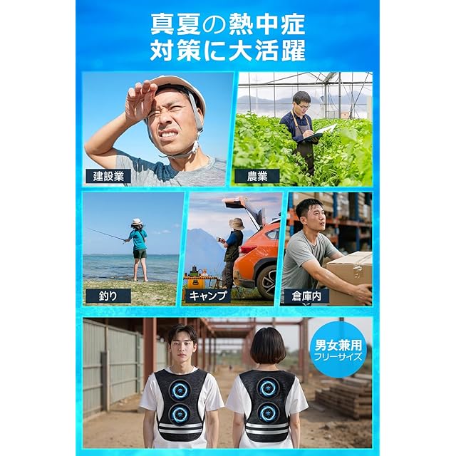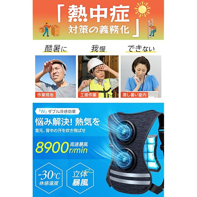 【圧倒的送風力!進化型ファン付きベストで猛暑を突破】 2025年新開発のファン付きベストは、上下2基の強力ファンが背中と腰に的確に風を送り、熱気を素早く排出。空調ウェアとしての構造がさらに進化し、風が体に沿って流れることで冷却効率が飛躍的に向上。風量は4段階(そよ風/快適/強力/ハリケーン)で調整可能。さらに、付属のアイスパックを併用すれば、体感温度が最大−30℃まで低下。屋外作業やスポーツ観戦、通勤中も快適な涼しさをキープ。暑さが厳しい日本の夏に最適な冷却ベストです。