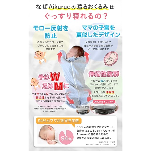 【赤ちゃんに安定した睡眠を】当社の着るおくるみは赤ちゃんの睡眠を妨る『モロー反射』を落ち着かせる効果あり、新生児の良質な睡眠に役立つといわれています。ママの子宮の中の居心地を再現したデザインになっている為、全身を優しく包み込んで赤ちゃんが最も楽な姿勢でぐっすりと眠れます。